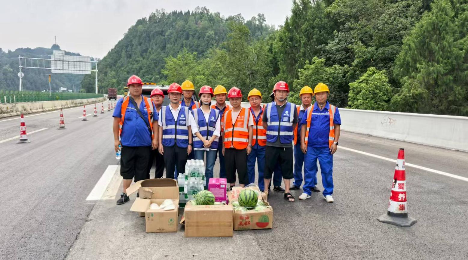 在巴達(dá)高速路面病害處治工程施工現(xiàn)場(chǎng),攤鋪機(jī)、壓路機(jī)往來作業(yè),一線筑路工人們頂著烈日,堅(jiān)守在滾燙的路面上,為公路的早日貫通揮灑汗水。公司工作人員一行來到現(xiàn)場(chǎng),將一箱箱冰鎮(zhèn)礦泉水、西瓜,以及藿香正氣水等清涼物資分發(fā)到工人手中,并叮囑大家在高溫天氣下注意勞逸結(jié)合,做好自我防護(hù)。