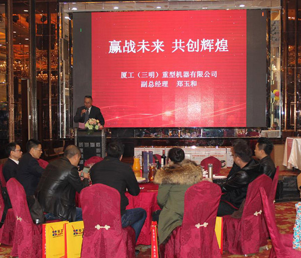 中午12時(shí),答謝會(huì)正式開始。廈工三重公司副總經(jīng)理鄭玉和先生首先發(fā)表致辭,表達(dá)了對(duì)新老客戶、經(jīng)銷商們的感謝,介紹了公司2018年的銷售政策和經(jīng)營目標(biāo),希望在新的一年里與大家攜手“贏戰(zhàn)未來、共創(chuàng)輝煌”。公司技術(shù)中心主任羅斯進(jìn)先生介紹了廈工三重建企60年的發(fā)展歷程及公司主導(dǎo)產(chǎn)品,銷售公司區(qū)域總監(jiān)吳建盛先生公布了現(xiàn)場訂購優(yōu)惠政策。會(huì)議現(xiàn)場,賓主交流融洽,互動(dòng)熱情,穿插進(jìn)行有獎(jiǎng)問答活動(dòng),更將現(xiàn)場的氣氛推向高潮